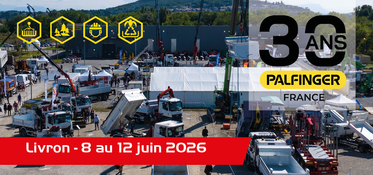 Ensemble, célébrons 30 ans d’engagement, d’innovation et de confiance. Nous vous donnons rendez-vous en juin 2026 à Livron-sur-Drôme (26) pour vivre cette semaine exceptionnelle dédiée aux solutions de levage Palfinger et aux professionnels de la manutention.